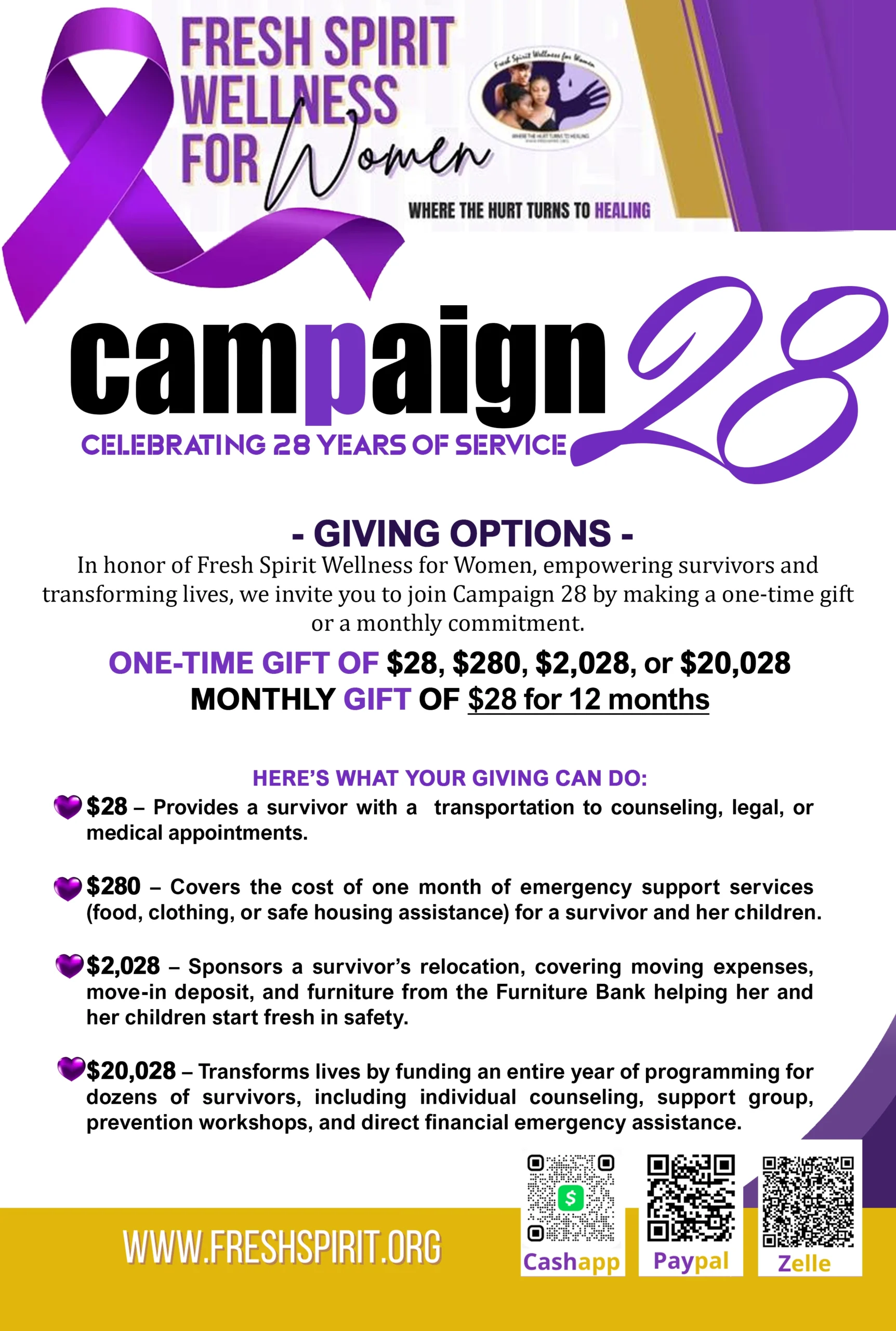 Fresh Spirit Wellness for Women, a longtime advocate for domestic violence survivors, recently suffered a devastating setback when our storage unit was vandalized, resulting in the loss of auction items, holiday toys, and essential supplies. Together, we can overcome this challenge and continue to bring joy to survivors and their families this holiday season.